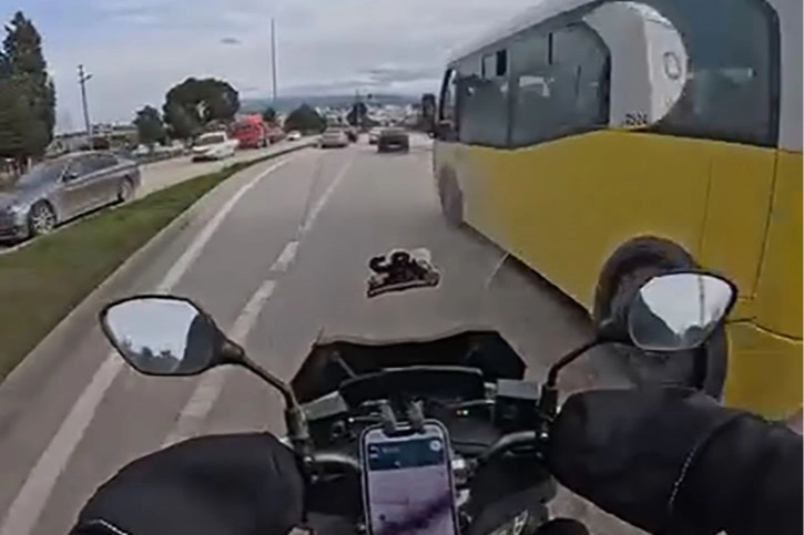 Olay, Bursa’nın Nilüfer ilçesine bağlı Üçevler Mahallesi Nilüfer Caddesi üzerinde meydana geldi. Kendi şeridinde ilerleyen motosiklet sürücüsünün önüne bir anda otobüs kırdı. Ani refleksle sol şeride geçerek kazadan son anda kurtulan motosikletli, otobüs şoförüne tepki gösterdi.