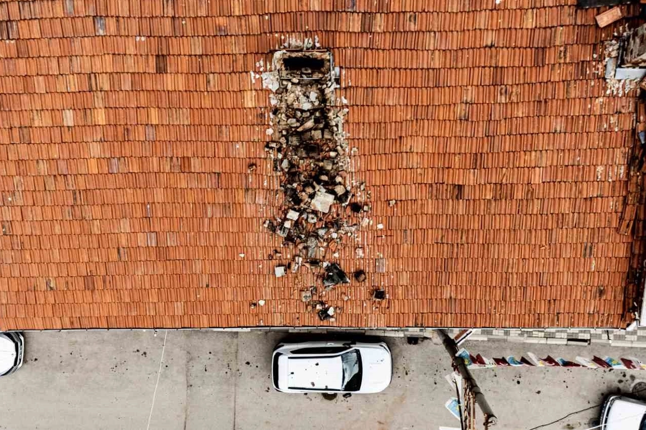 Olay, Keles ilçe merkezinde meydana geldi. Alınan bilgilere göre, bir evin çatısındaki eski baca, aniden gürültüyle çöktü.