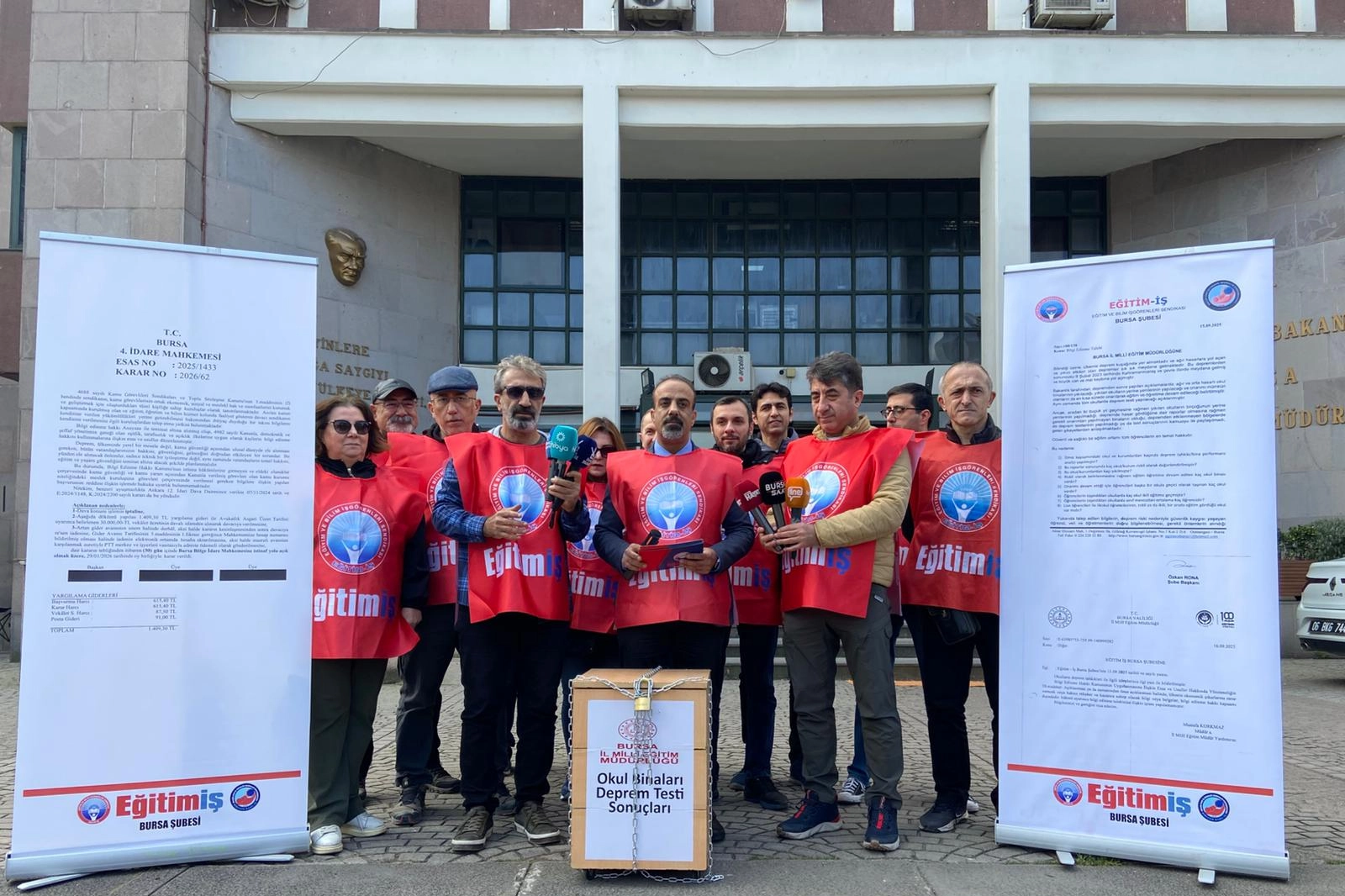 Eğitim-İş Bursa Şube Başkanı Özkan Rona, Bursa İl Milli Eğitim Müdürlüğü önünde gerçekleştirdiği basın açıklamasında okulların deprem dayanıklılığına dair raporların kamuoyuyla paylaşılmadığını iddia etti. Rona, sonuçlanan davada haklı bulunduklarını vurgulayarak, raporların kamuya açık hale getirilmesi için İl Milli Eğitim Müdürlüğü’ne 24 Mart’a kadar süre tanıdıklarını ifade etti.