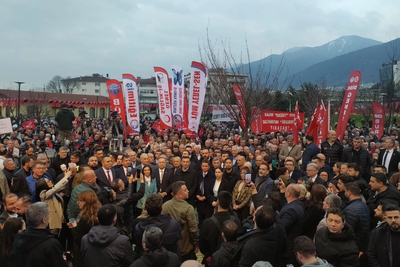 Belediye binası önündeki binlerce Bursalı, Gökhan Zeybek ve Özgür Çelik’in konuşmaları sırasında sık sık "Hak, hukuk, adalet" ve "Mustafa Bozbey onurumuzdur" sloganları attı. Emniyet güçlerinin geniş güvenlik önlemi aldığı alanda, kalabalığın bekleyişi sürüyor.