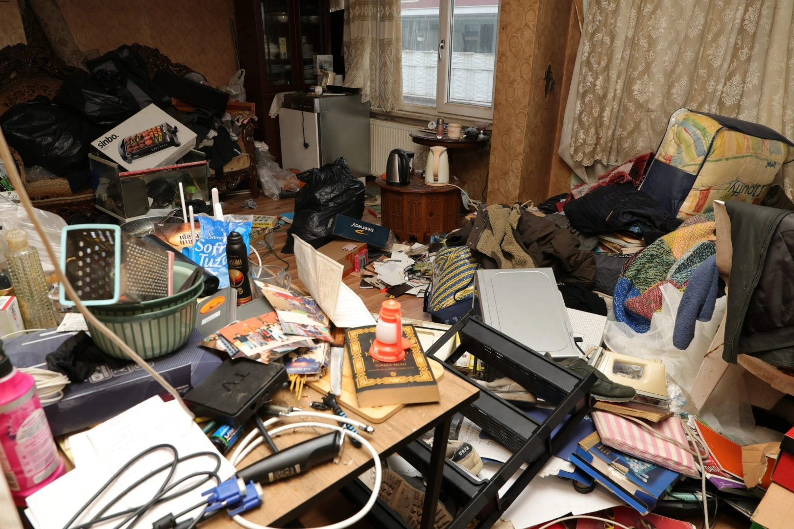 Mahkeme kararıyla gerçekleştirilen temizlik çalışmasında, uzun süredir biriktirilen eşyalar ve atıklar nedeniyle oluşan kötü koku ortadan kaldırıldı.