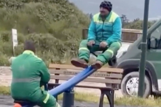 Bursa’da görev yapan belediye temizlik işçilerinin iş arası verdikleri kısa molada tahterevalliye binerek sergiledikleri samimi görüntüler gündem oldu.