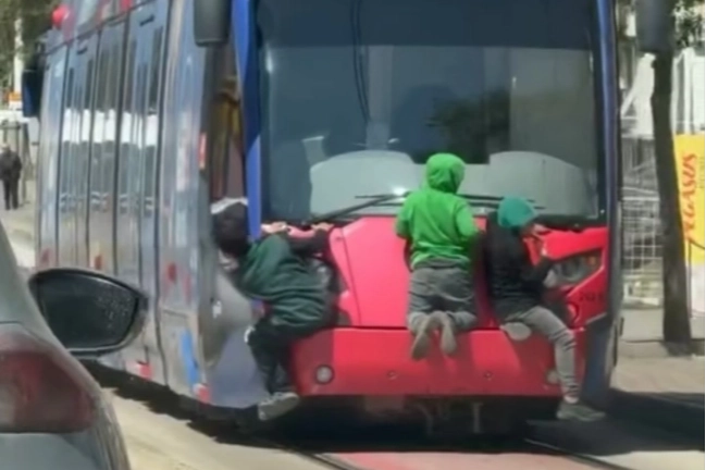 Hareket halindeki tramvayın arkasına tutunan çocuklar metrelerce bu şekilde ilerledi. Çocukların bu tehlikeli yolculuğunu gören vatandaşlar duruma tepki gösterirken, görüntüler birçok kişiye ‘pes’ dedirtti.