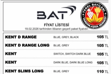 Tekel Bayileri Yardımlaşma Derneği (TBYD) Başkanı Erol Dündar, British American Tobacco (BAT) grubuna ait sigaralara zam geldiğini duyurdu. Zamlı fiyatlar 19 Şubat tarihinden itibaren geçerli olacak. Güncel fiyatlar şöyle: Kent D Range (Blue, Grey, Black) - 105 TL Kent D Range Long (Blue, Grey) - 105 TL Kent (Switch, Switch Dark Blue) - 105 TL Kent (Dark Blue, Dark Blue Long) - 105 TL Kent Slims Long (Blue, Grey) - 110 TL Kent Slims (Black, Grey) - 115 TL Kent (Blue, White) - 115 TL Rothmans Tüm Ürünler: 100 TL Tekel 2000 Tüm Ürünler: 100 TL Tekel 2001 Tüm Ürünler: 105 TL Viceroy Tüm Ürünler: 105 TL Pall Mall Tüm Ürünler: 105 TL Maltepe & Samsun Tüm Ürünler: 105TL