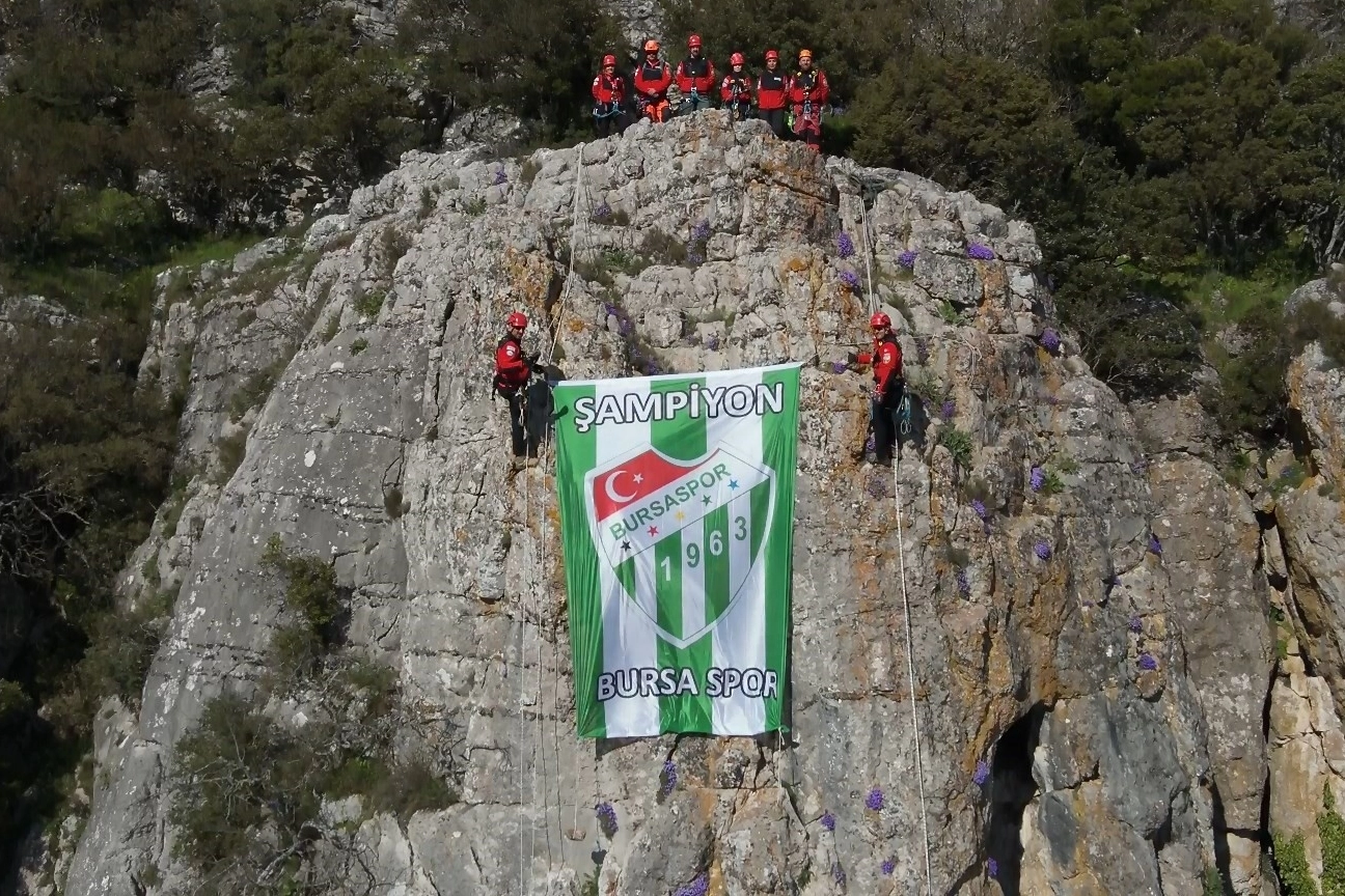 Tatbikatın sonunda zirveye ulaşan ekipler, Bursaspor bayrağını açarak anlamlı bir mesaj verdi.