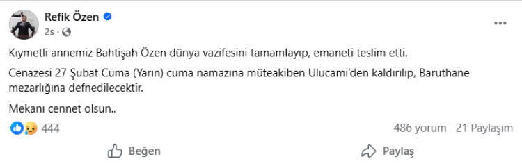 Refik Özen'in annesi Bahtişah Özen vefat etti.