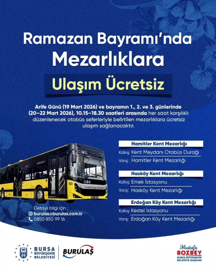 Bursa Büyükşehir Belediyesi, 19-22 Mart 2026 tarihleri arasında Hamitler, Hasköy ve Erdoğan Köy mezarlıklarına ücretsiz otobüs seferleri düzenleyecek. Kent Meydanı, Emek ve Kestel'den saat başı kalkacak seferler, 10.15-18.30 saatleri arasında olacak.