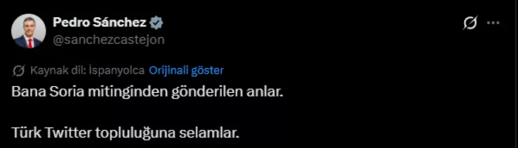 İspanya Başbakanı Pedro Sanchez, Soria'daki mitingde Türk bayrağı görülen bir görüntüyü paylaştı. “Türk sosyal medya topluluğuna selamlar olsun” dedi.