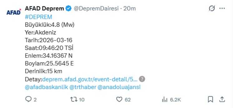Akdeniz'de saat 09.46'da 4.8 büyüklüğünde deprem! AFAD'ın verilerine göre merkez üssü Akdeniz olan sarsıntı kaydedildi. (16 Mart 2026)
