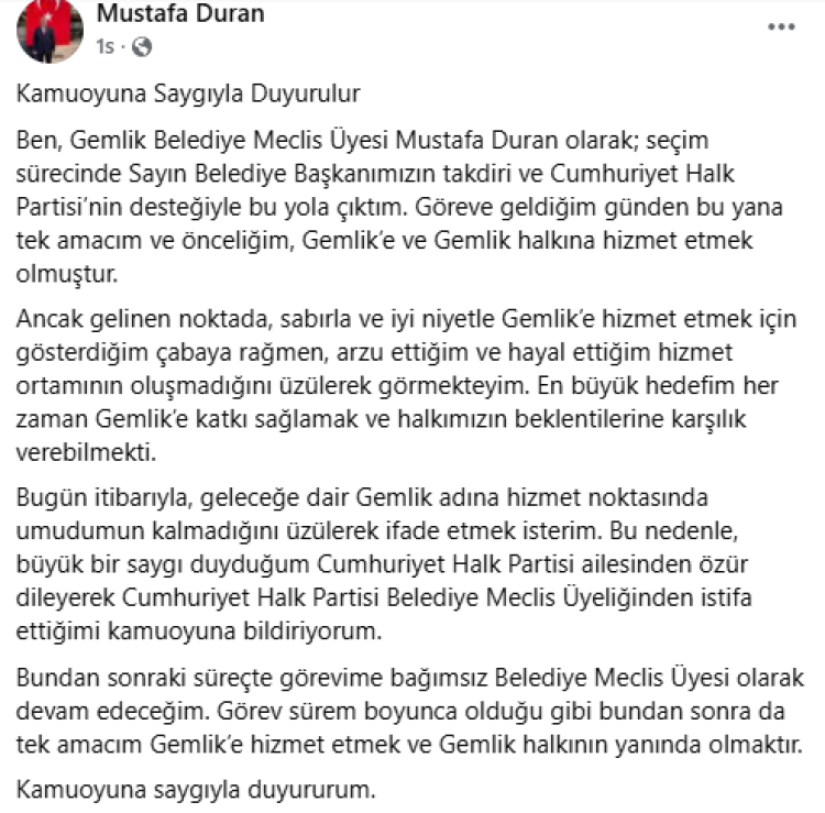 Gemlik Belediye Meclis Üyesi Mustafa Duran, Cumhuriyet Halk Partisi’nden (CHP) istifa ettiğini kamuoyuna duyurdu