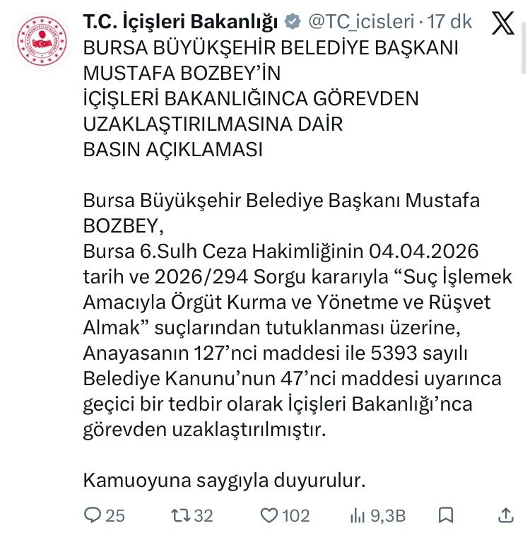 İçişleri Bakanlığı'nın resmi hesabından yapılan paylaşımda Mustafa Bozbey'in, üzerine atılı suçlamalar nedeniyle tutuklanması üzerine, ilgili Belediye Kanunu uyarınca görevinden uzaklaştırılmasına karar verildiği açıklandı.